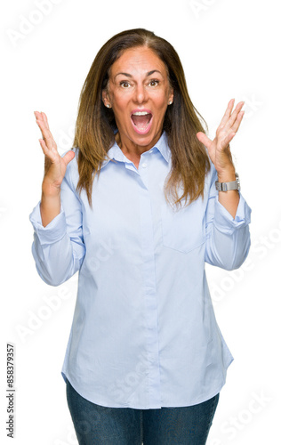 Beautiful middle age business adult woman over isolated background celebrating crazy and amazed for success with arms raised and open eyes screaming excited. Winner concept