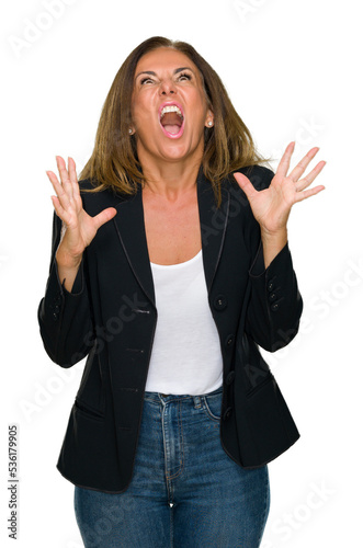 Beautiful middle age business adult woman over isolated background crazy and mad shouting and yelling with aggressive expression and arms raised. Frustration concept.