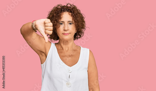 Beautiful middle age mature woman wearing casual white shirt looking unhappy and angry showing rejection and negative with thumbs down gesture. bad expression.