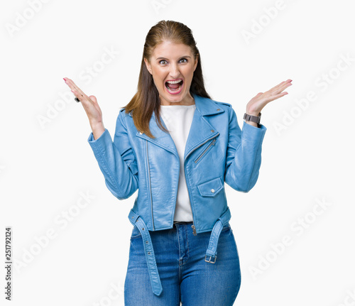 Beautiful middle age mature woman wearing fashion leather jacket over isolated background celebrating crazy and amazed for success with arms raised and open eyes screaming excited. Winner concept