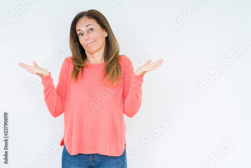 Beautiful middle age woman over isolated background clueless and confused expression with arms and hands raised. Doubt concept.