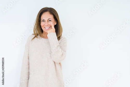 Beautiful middle age woman over isolated background Pointing to the eye watching you gesture, suspicious expression