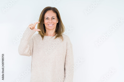 Beautiful middle age woman over isolated background smiling and confident gesturing with hand doing size sign with fingers while looking and the camera. Measure concept.