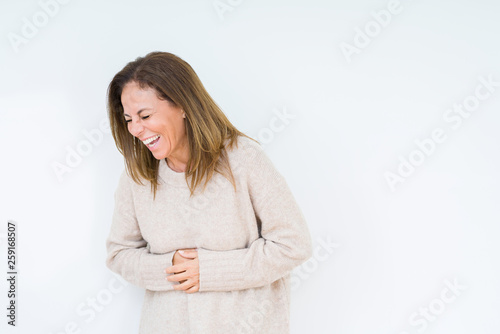 Beautiful middle age woman over isolated background with hand on stomach because nausea, painful disease feeling unwell. Ache concept.