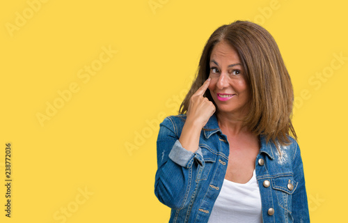 Beautiful middle age woman wearing casual denim jacket over isolated background Pointing to the eye watching you gesture, suspicious expression