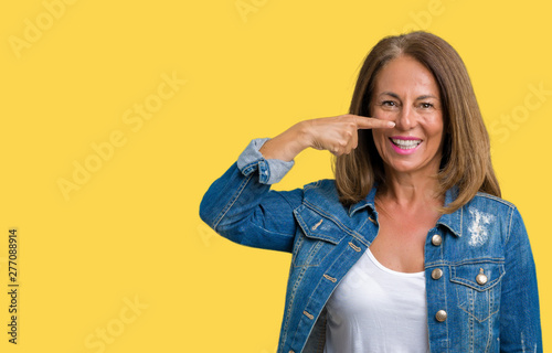 Beautiful middle age woman wearing casual denim jacket over isolated background Pointing with hand finger to face and nose, smiling cheerful