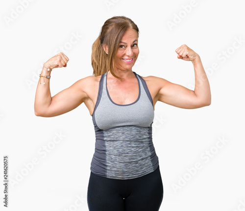 Beautiful middle age woman wearing sport clothes over isolated background showing arms muscles smiling proud. Fitness concept.