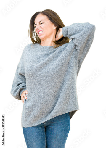 Beautiful middle age woman wearing winter sweater over isolated background Suffering of neck ache injury, touching neck with hand, muscular pain