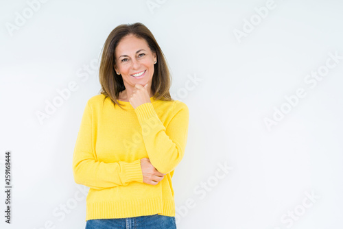 Beautiful middle age woman wearing yellow sweater over isolated background looking confident at the camera with smile with crossed arms and hand raised on chin. Thinking positive.