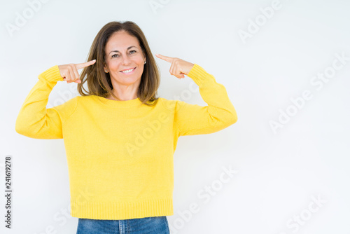 Beautiful middle age woman wearing yellow sweater over isolated background Smiling pointing to head with both hands finger, great idea or thought, good memory