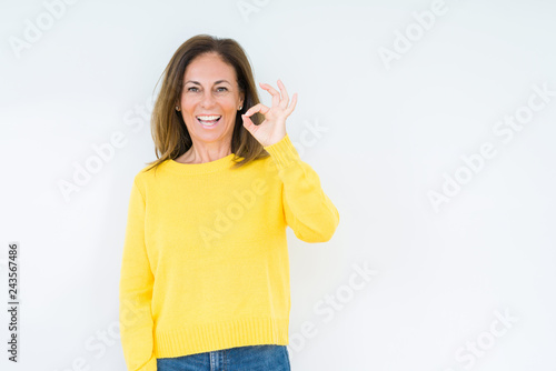 Beautiful middle age woman wearing yellow sweater over isolated background smiling positive doing ok sign with hand and fingers. Successful expression.