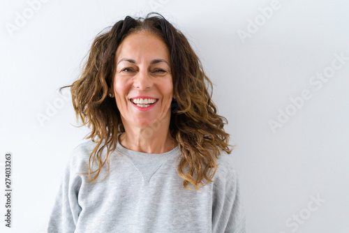 Beautiful middle age woman with curly hair smiling cheerful and happy, laughing with a big smile on face showing teeth over white isolated background