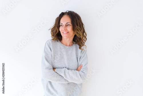 Beautiful middle age woman with curly hair smiling cheerful and happy with arms crossed, laughing with a big smile on face showing teeth over white isolated background