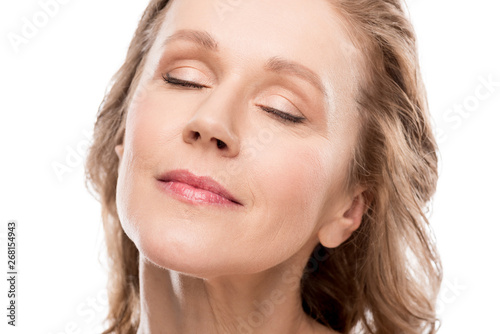 beautiful middle aged woman with clean face and eyes closed Isolated On White