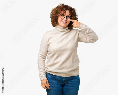 Beautiful middle ager senior woman wearing turtleneck sweater and glasses over isolated background Pointing with hand finger to face and nose, smiling cheerful