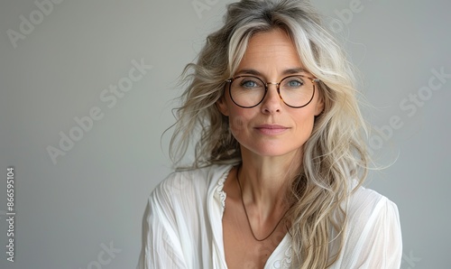 Beautiful middle-aged businesswoman in glasses poses confidently with a smile while standing against a white background.