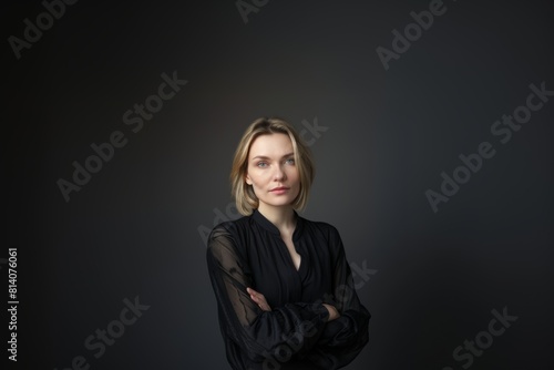 Beautiful middle-aged woman on a gray background in a black blouse.