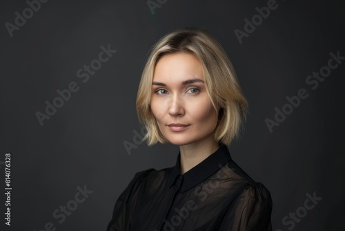 Beautiful middle-aged woman on a gray background in a black blouse.