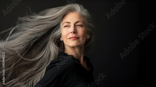 Beautiful Middle-Aged Woman With Long Silver Hair Flowing in the Wind, Confident Smile, Black Background.