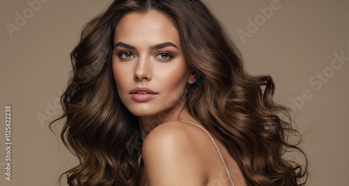 Beautiful model girl with long wavy and shiny hair . Brunette dirl with curly hairstyle. Beauty smiling woman with curly hairstyle dye .Fashion, cosmetics and makeup . Cosmetology