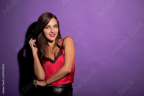 Beautiful model woman demonstrating her gorgeous brown hair while posing for photographer isolated on violet background in studio.