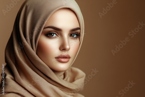 Beautiful modern Muslim woman in beige hijab natural makeup.