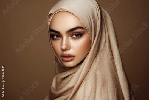 Beautiful modern Muslim woman in beige hijab natural makeup.