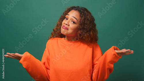 Beautiful multi-ethnic woman shrugs shoulders, green studio background