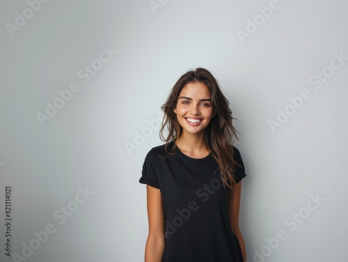 Beautiful natural brunette woman, smiling and looking in camera with white teeth. Close-up portrait of cute female woman in black t-shirt on white background.