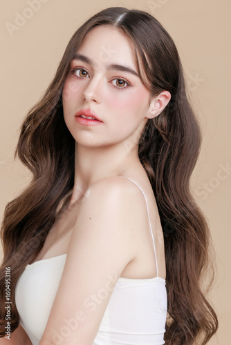 Beautiful portrait Caucasian woman makeup of cosmetic on face smile attractive isolated on beige background.
