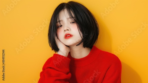 Beautiful portrait of a young Asian woman with black hair against a yellow background.