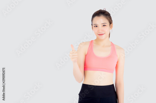 Beautiful portrait young asian woman in sport clothes with satisfied and confident gesture thumbs up isolated on white background, asia girl have shape and wellness, exercise for fit with health.