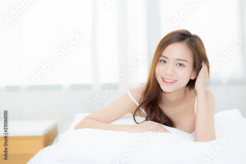 Beautiful portrait young asian woman lying and smile while wake up with sunrise at morning, lifestyle and relax concept.
