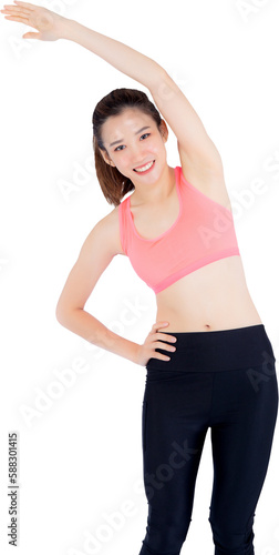 Beautiful portrait young asian woman standing stretch muscle arm, girl wear sport clothes exercise and yoga for health, wellness concept.