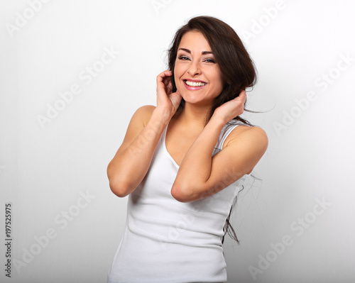 Beautiful positive excited laughing young woman holding the hands the hair in white shirt and with toothy smile on white background