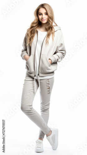 Beautiful positive stylish model girl in white color hoodie, full-length, on a white background