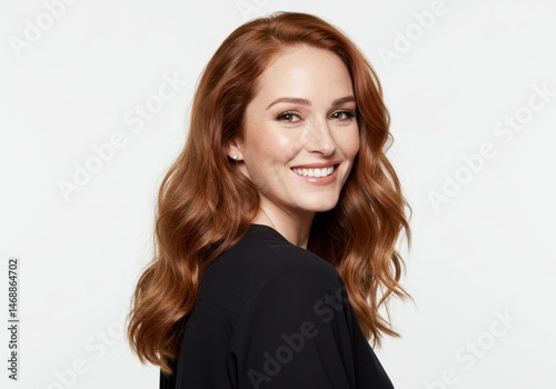 Beautiful Redhead Woman Smiling in Black Shirt Studio Portrait Isolated on White Background