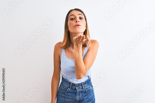 Beautiful redhead woman standing over isolated background looking at the camera blowing a kiss with hand on air being lovely and sexy. Love expression.