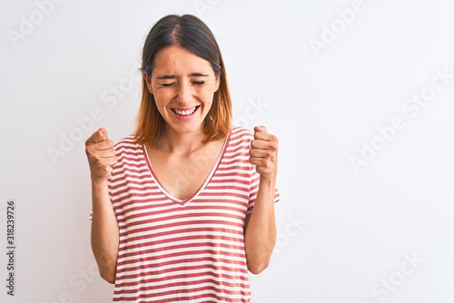 Beautiful redhead woman wearing casual striped red t-shirt over isolated background excited for success with arms raised and eyes closed celebrating victory smiling. Winner concept.