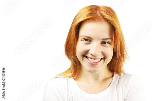 Beautiful redheaded young woman with satisfied facial expression, isolated on white background. Attractive female with natural red hair & brown eyes showing sincere smile & perfect teeth. Copy space.