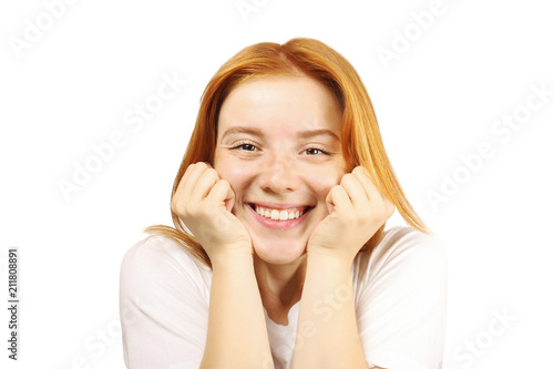 Beautiful redheaded young woman with satisfied facial expression, isolated on white background. Attractive female with natural red hair & brown eyes showing sincere smile & perfect teeth. Copy space.