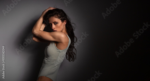 Beautiful sexy woman with long hair looking in camera, sport strong body, with half shadow on the face. Closeup banner portrait with empty copy space. Art.