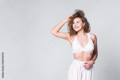 Beautiful sexy young blonde woman with long wavy hair ,figure perfect body and pretty face make-up . Copy space! Candid emotions!