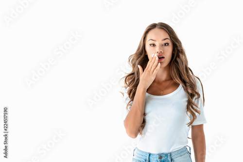 beautiful shocked woman looking at camera, isolated on white