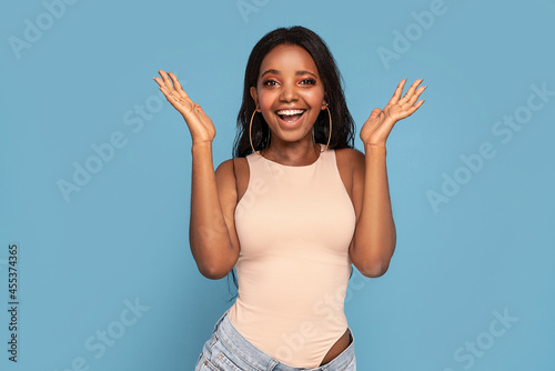 Beautiful smiling african american woman with glamour makeup and long dark hair looking at the camera.