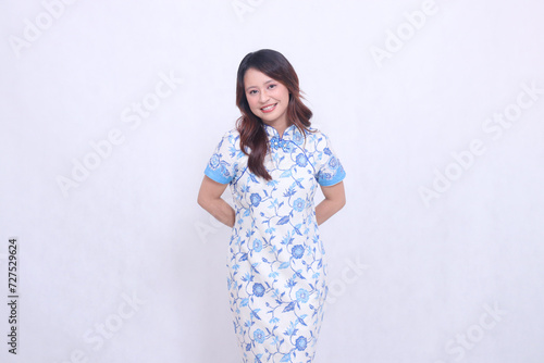 Beautiful smiling asian woman wearing modern chinese dress hands back isolated on white background. happy Chinese New Year