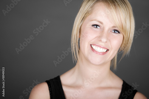 Beautiful Smiling Blonde Girl against Grey Background