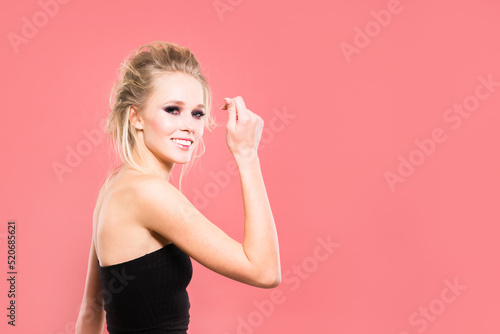 Beautiful smiling girl on a pink background in the studio.