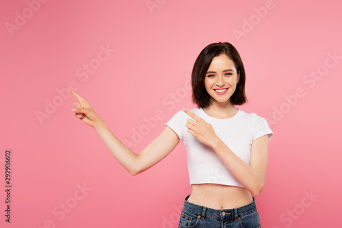 beautiful smiling girl pointing with fingers aside isolated on pink