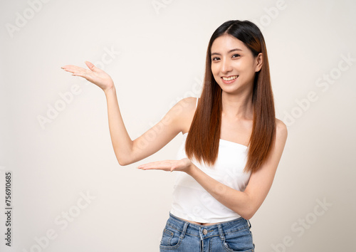 Beautiful smiling happy young asian woman age around 25. Charming female lady standing pose on isolated white background. Asian attractive woman people looking camera confident with backdrop.